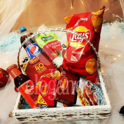 Perfect BBQ edibles basket with a great mix of munchies and spices packed to the brim, making it an ideal basket for a bbq party. Arrives in a basket with a net and ribbon packaging.