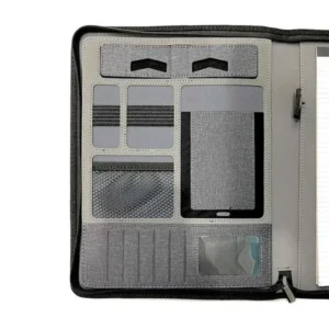 Introducing our Smart Multifunction Laptop Case, a cutting-edge accessory designed for the modern professional. With built-in wireless charging capabilities, an 8000mAh power bank, and a pen grip for added convenience, this case seamlessly combines functionality with style. Stay connected on-the-go with the 64GB USB storage and versatile charging cable compatibility for Android, iOS, and C-Type devices. Crafted from a luxurious leather texture notebook, it not only provides a sleek look but also offers practical features such as a cardholder space and a lightweight design at just 100gsm.