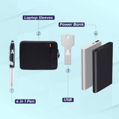 - 4 in 1 Pen: This classy corporate gift is known as a 4 in 1 pen. It features a Stylus, Torch, Mobile Holder and a pen. Its personalization makes it one of the most unique corporate gifts for employees.